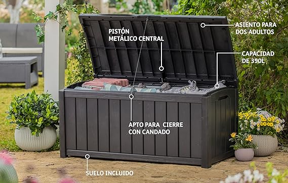 Este modelo ofrece una capacidad aproximada de 390 litros, suficiente para guardar cojines, accesorios de terraza, herramientas ligeras, productos de jardín o distintos objetos de exterior de uso habitual.